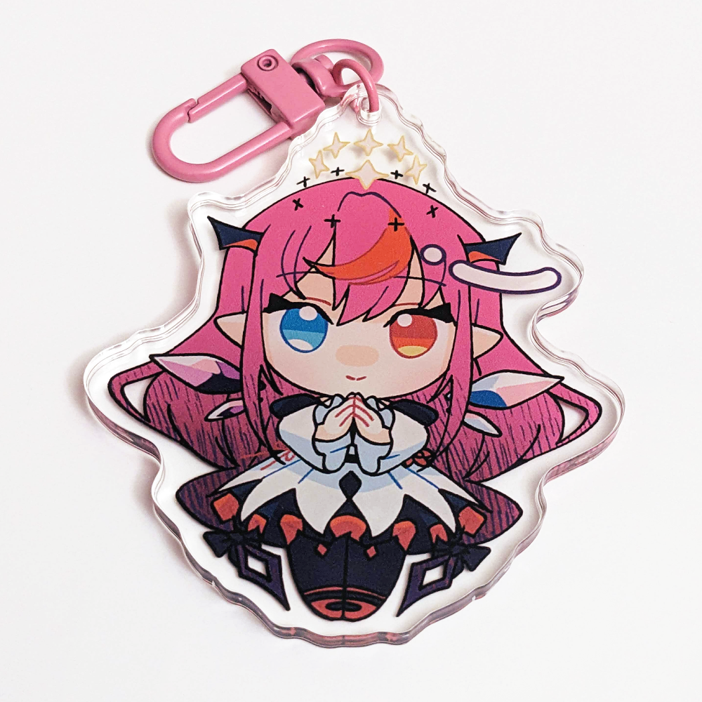 6-centimeter double-sided clear acrylic keychains with various colored clasps.